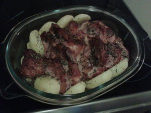 Elkészítése rettentő egyszerű. A sonka majd egészét szűk egy centi vastag darabokra vágjuk. Néhány szeletet a zsírosabb részről viszont vékonyra veszünk, evvel kibéleljük az edény alját. Ezekre a vékony szeletekre rádarabolunk jó nagy darabokban egy kiló krumplit. Erre a krumpliágyra tesszük a feldarabolt sonkát. Megszórjuk kevés borsikafűvel, kicsit bővebben fokhagymaporral, és némi tárkonnyal. Rátesszük a fedőt, és hideg sütőbe betesszük 190-200 fokra szűk 2 órára. a végefelé érdemes megnézni, hogy a zsíros részek mindenhol szépen üvegesedni kezdtek e. Ha még sültebbre akarjuk, vissza lehet tenni plusz negyed órára.