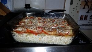 Elkészíteni nagyon egyszerű. Vajjal kikenünk egy nagyobb jénait, felkockázzuk a megpucolt krumpli több mint felét, és egyenletesen beterítjük vele az edény alját. Kisebb kockákra vágva erre szórjuk a sárgarépát. Ezt megszórjuk a fokhagymaporral. Erre tesszük a a kétféle reszeltsajtból, apróra vágott sonkából, tárkonyból, borsikafűből, és a fele bazsalikomból tejföllel összekevert “krémet”. szétterítjük teljesen a krumplin, répán. majd a maradék krumplit egyenletesen rákockázzuk. Ezután megszórjuk a petrezselyemmel. Majd a karikára, vagy félkarikára vágott hagymát levelenként elosztjuk a tetején, ezen pedig a karikára vágott paradicsomot, legvégül pedig a karikára vágott paprikát. Az egészet megszórjuk bazsalikommal. Lefedjük alufóliával, majd 1 óra 10 percre 200 fokra (a maxra amit bír az edény) betesszük sülni. Fontos hogy hideg sütőbe tegyük, együtt melegedjen az edénnyel a sütő! Ha lejár az idő, levesszük a fóliát, majd anélkül még sütjük 40 percet. Nem szabad megijedni, hogy amikor levesszük a fóliát sok a leve, ez eltűnik a fólia nélküli sütéskor. Végül amikor kész, a tetejére ha hagytunk egy kis sajtot, még forrón ráreszeljük.